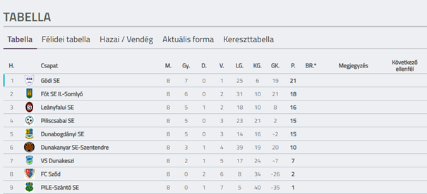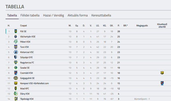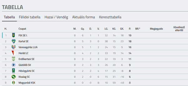 Fót SE I. Felnőtt Csapat Tabella