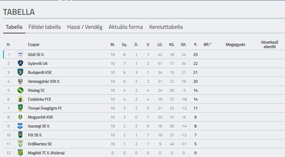 Fó SE II. Felnőtt Csapat Tabella